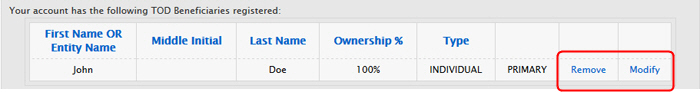 - To remove a beneficiary, on the TOD Beneficiaries page, click the Remove link on the row listing the beneficiary.